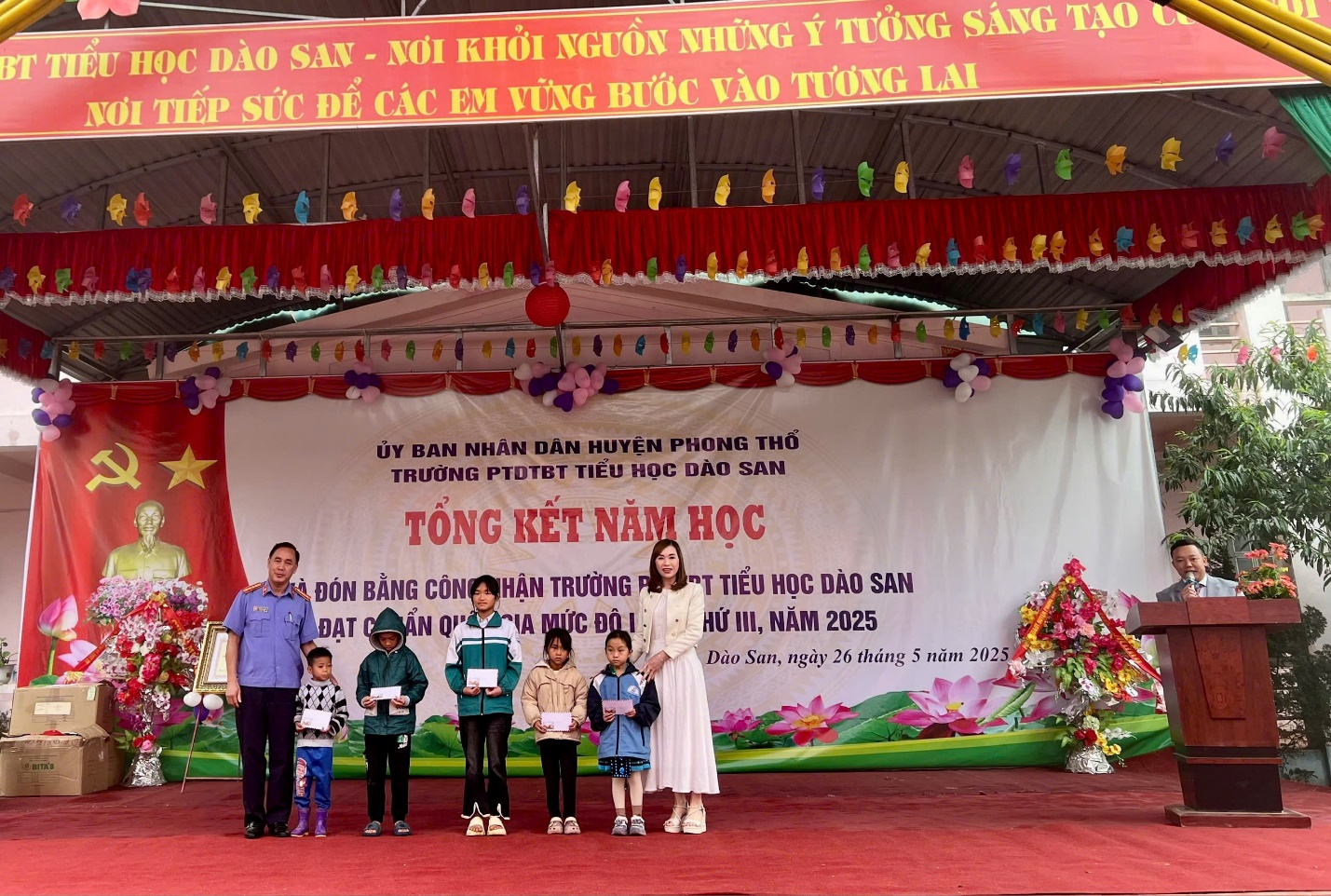 Phát huy vai trò đồng hành cùng sự nghiệp giáo dục và trách nhiệm với cộng đồng, VKSND tỉnh Lai Châu phối hợp với Công ty Cổ phần Sản xuất hàng tiêu dùng Bình Tân Chi nhánh Lào Cai (có trụ sở tại số 52 đường Nguyễn Huệ, phường Lào Cai, thành phố Lào Cai, tỉnh Lào Cai) trao tặng 100 đôi giày, trị giá 30 triệu đồng, cho học sinh nhà trường trong khuôn khổ Chương trình “Giày học đường - Tiếp bước tài năng trẻ”. Đây là hoạt động thiện nguyện thường niên, thể hiện sự quan tâm sâu sắc tới học sinh vùng cao, góp phần tiếp thêm động lực, tạo điều kiện để các em an tâm học tập, rèn luyện. Nhân dịp này, cá nhân đồng chí Nguyễn Huy Thắng, Phó Viện trưởng phụ trách VKSND tỉnh đã trao tặng 05 suất quà cho các em học sinh có hoàn cảnh khó khăn, nỗ lực vươn lên trong học tập, lan tỏa thông điệp nhân ái và tinh thần sẻ chia trong cộng đồng. Trong không khí long trọng của buổi Lễ, thay mặt Ban Giám hiệu Nhà trường, đồng chí Phạm Thị Xuân, Hiệu trưởng trường PTDTBT Tiểu học xã Dào San bày tỏ sự trân trọng, cảm ơn sâu sắc đến VKSND tỉnh Lai Châu và Công ty Sản xuất hàng tiêu dùng Bình Tân. Nhà trường cũng mong rằng trong thời gian tới sẽ tiếp tục nhận được sự quan tâm, ủng hộ hơn nữa từ VKSND tỉnh Lai Châu.