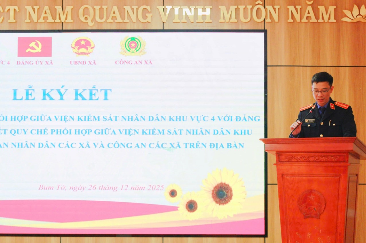 Cùng với đó, VKSND khu vực 4 đã ký kết Quy chế phối hợp với UBND và Công an các xã, tạo cơ sở pháp lý cho việc phối hợp toàn diện, thường xuyên trong trao đổi thông tin, tiếp nhận và giải quyết tố giác, tin báo về tội phạm; giải quyết khiếu nại, tố cáo; thi hành án hình sự tại cộng đồng; quản lý người bị áp dụng biện pháp ngăn chặn và tuyên truyền, giáo dục pháp luật tại cơ sở. Quy chế cũng xác định rõ trách nhiệm của từng cơ quan, từng chức danh, đề cao vai trò người đứng đầu góp phần hạn chế chồng chéo, bỏ sót nhiệm vụ.
