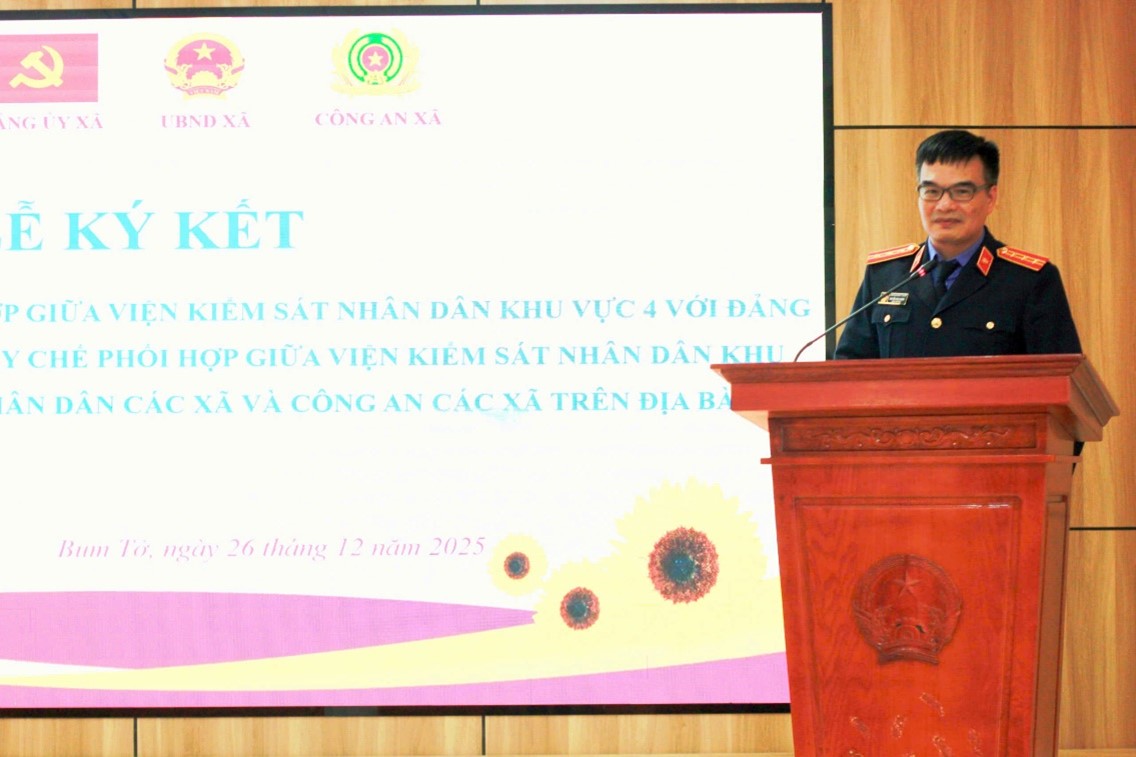 Tại buổi lễ, đại diện VKSND khu vực 4 và Đảng ủy các xã đã ký kết Chương trình phối hợp nhằm cụ thể hóa mối quan hệ lãnh đạo, chỉ đạo của cấp ủy Đảng đối với công tác nội chính, tư pháp; bảo đảm sự gắn kết chặt chẽ giữa nhiệm vụ chuyên môn của Viện kiểm sát với nhiệm vụ chính trị của địa phương. Chương trình phối hợp tập trung vào các nội dung trọng tâm như: bảo đảm an ninh chính trị, trật tự an toàn xã hội; phòng, chống tội phạm và vi phạm pháp luật; công tác tuyên truyền, phổ biến, giáo dục pháp luật; xây dựng Đảng, kiểm tra, giám sát và quản lý đảng viên sinh hoạt nơi cư trú.