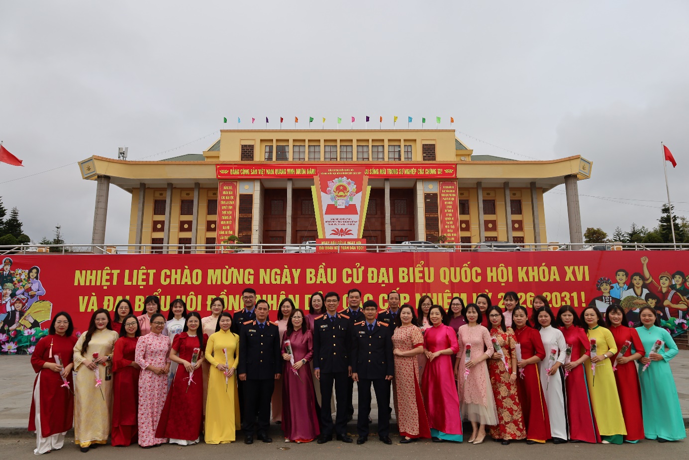 Trong không khí trang trọng, ấm áp và đầy ý nghĩa, các hoạt động tuyên truyền về truyền thống 116 năm Ngày Quốc tế Phụ nữ, 1986 năm Khởi nghĩa Hai Bà Trưng và thông điệp của Liên hợp quốc về Ngày Quốc tế Hạnh phúc 20/3 đã được triển khai sâu rộng. Hưởng ứng “Tuần lễ Áo dài” (từ ngày 01/3 đến ngày 08/3/2026), sáng ngày 06/3/2026, toàn thể nữ công chức, người lao động VKSND tỉnh đã đồng loạt mặc trang phục áo dài truyền thống khi làm việc và tham gia chụp ảnh lưu niệm. Hình ảnh nữ công chức, người lao động ngành Kiểm sát trong bộ trang phục Ngành nghiêm trang, chỉn chu luôn toát lên vẻ bản lĩnh, chuẩn mực và tinh thần thượng tôn pháp luật. Nhưng khi khoác lên mình tà áo dài truyền thống, vẻ đẹp ấy lại được điểm tô thêm sự dịu dàng, duyên dáng và đậm đà bản sắc văn hóa dân tộc. Hai hình ảnh ấy hòa quyện, vừa thể hiện phẩm chất của người cán bộ Kiểm sát kiên định, trách nhiệm, vừa tôn vinh nét đẹp thanh lịch, mềm mại của người phụ nữ Việt Nam.