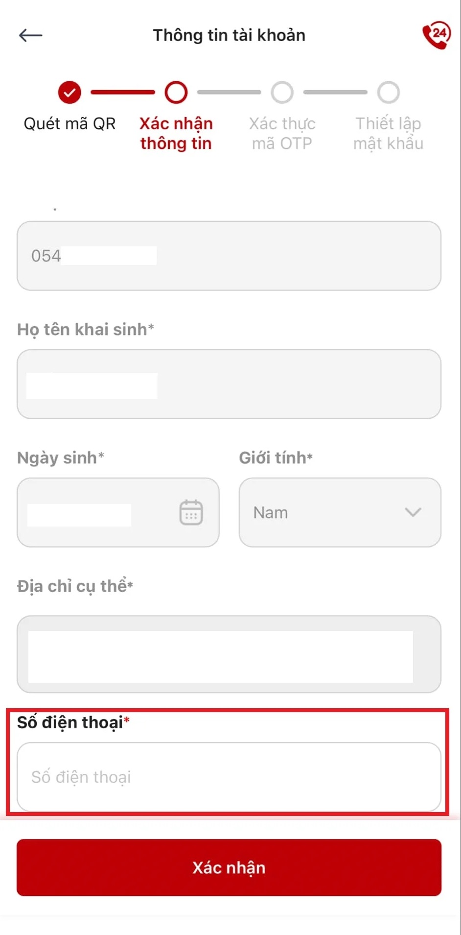 - Điền thông tin cá nhân: Tại bước này, khi Quét mã QR trên Căn cước công dân gắn chíp/Thẻ Căn cước, hệ thống đã tự động điền các thông tin, cá nhân chỉ điền thêm số điện để nhận được mã xác thực OTP.