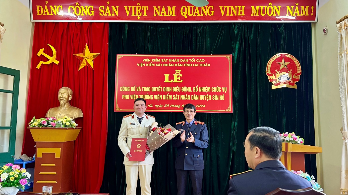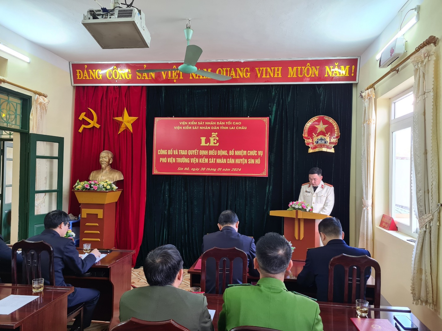 Tại buổi lễ, đồng chí Nguyễn Đăng Đản, Phó Trưởng phòng tổ chức cán bộ VKSND tỉnh đã công bố quyết định của VKSND tối cao về việc điều động, bổ nhiệm đồng chí Nguyễn Thành Luân, Kiểm sát viên trung cấp Phòng thực hành quyền công tố kiểm sát điều tra, kiểm sát xét xử sơ thẩm án hình sự VKSND tỉnh Lai Châu giữ chức vụ Phó Viện trưởng VKSND huyện Sìn Hồ, thời hạn bổ nhiệm 05 năm kể từ ngày 01/02/2024. Trao quyết định và phát biểu giao nhiệm vụ đồng chí Nguyễn Xuân Hòa, Phó Viện trưởng VKSND tỉnh đề nghị đồng chí tân Phó Viện trưởng VKSND huyện tiếp tục phát huy năng lực, trí tuệ, nhanh chóng cùng các đồng chí trong tập thể lãnh đạo đơn vị thực hiện toàn diện các mặt công tác theo chương trình kế hoạch năm 2024 của đơn vị. Trong đó, đặc biệt chú trọng thực hiện các nhiệm vụ trọng tâm, khâu đột phá, tuyệt đối không làm oan, sai bỏ lọt tội phạm. Xây dựng tập thể đoàn kết, dân chủ, thống nhất. Tham mưu kịp thời cho cấp ủy chính quyền địa phương các nhiệm vụ về cải cách tư pháp nói riêng và đấu tranh phòng chống tội phạm nói chung.