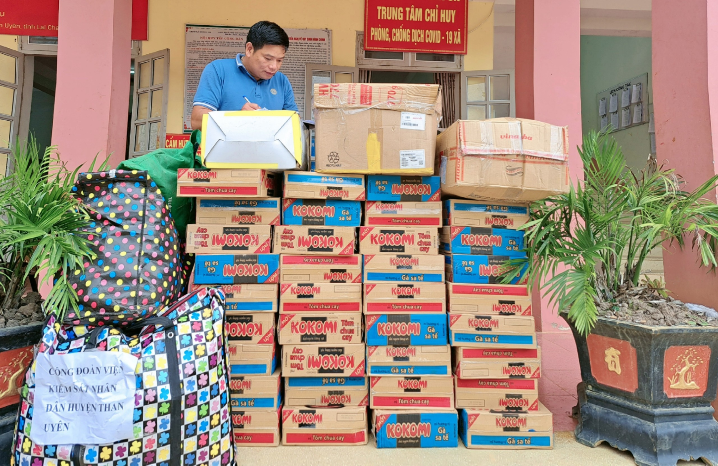 Ảnh Hoàng Văn Hương – Chủ tịch Mặt trận tổ quốc xã Khoen On kiểm kê đồ do Công đoàn Viện kiểm sát nhân dân huyện Than Uyên hỗ trợ